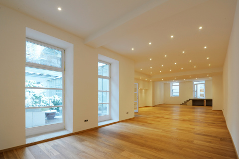 Durch die Deckenhöhe von 3,60 m, den üppig gesetzten Downlights und den liebevoll beleuchteten architektonischen Details, strahlt dieser eine ganz besondere Atmosphäre aus. Über die gesamte Fläche mit Fußbodenheizung wurden selten schöne Eichendielen gelegt. Mit einer Gesamtlänge von 17 m und einer Breite von 6,50 m ( im hinteren Bereich 3,84 m ) bietet diese diverse Möglichkeiten.