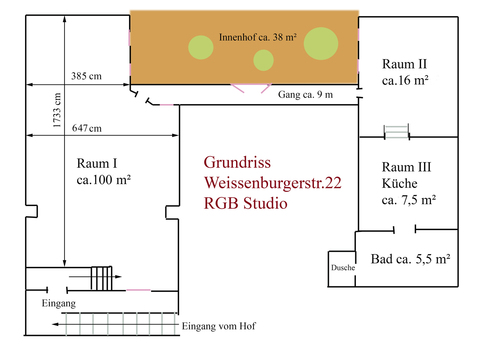 Über den grünen Innenhof der Weissenburgerstr.22 gelangt man über einen separaten Eingang, ein paar Stufen runter, in diese selten geschnittenen Räume.