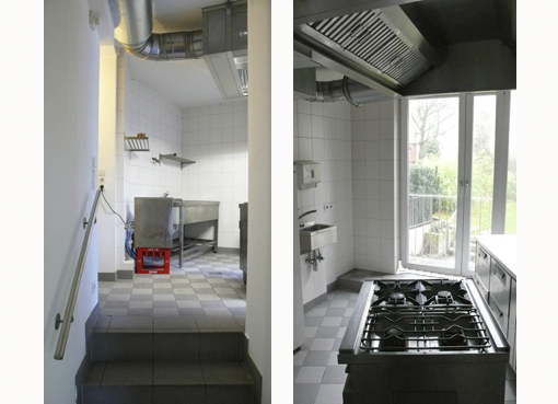 Getrennte WC-Anlagen, helle Küche ca.25m² mit großen Fenstertüren, Lagerraum mit Fettabscheider, Kellerraum, Personal-WC.